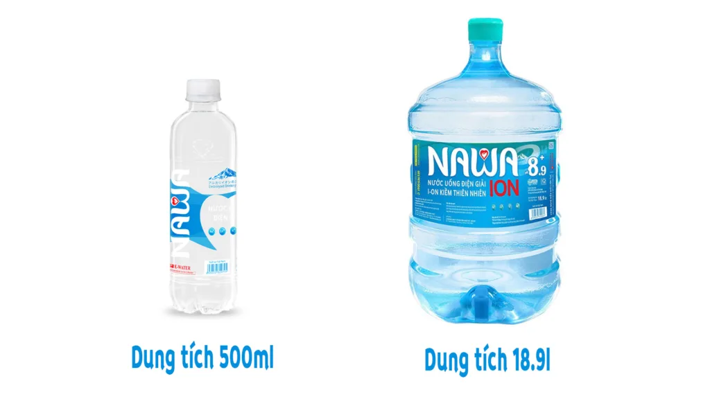 Hiện tại nước uống điện giải ion kiềm thiên nhiên Nawa có 2 dòng dung tích: 500ml và 18.9L
